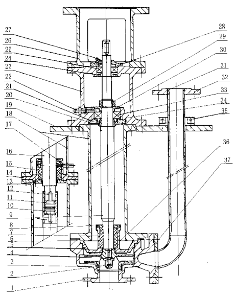 1、 泵體 2、葉輪螺母 3、葉輪 4、墊片 5、泵蓋 6、立柱管 7、導(dǎo)軸管 8、導(dǎo)軸承蓋 9、泵軸 10、傳動(dòng)套 11、聯(lián)接管 12、鍵 13、中間導(dǎo)軸承壓蓋 14、中間導(dǎo)軸承座 15、中間導(dǎo)軸承 16、泵軸 17、潤滑液管路 18、立柱管 19、支承座 20、甩液套 21、下軸承壓蓋 22、黃油杯 23、軸承座 24、上軸承檔圖 25、軸承 26、電機(jī)座 27、黃油杯 28、上軸承壓蓋 29、鎖緊螺母 30、下軸承擋圈 31、出液管 32、出液口法蘭 33、軸承 34、油封 35、對(duì)半法蘭 36、鍵 37、墊片 38、下軸承壓蓋