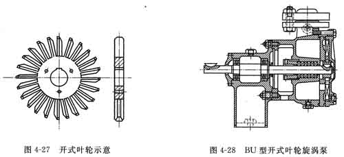②開(kāi)式葉輪 圖4-27所示為常用的開(kāi)式葉輪,液體自葉輪側(cè)面(小直徑處)進(jìn)入葉片間,葉片中心線處沒(méi)有隔板。具有這種葉輪形式的旋渦泵汽蝕性能較高,可以做成自吸泵和氣液混輸泵,但體積較大,效率低(η=0.2~0.4)。典型結(jié)構(gòu)如圖4-28所示。