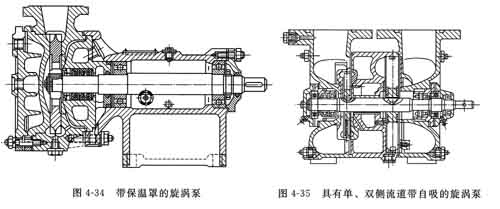 ①保溫旋渦泵 某些化學(xué)工業(yè)用泵,對(duì)輸送液體要求保持一定的溫度。否則液體可能揮發(fā)、結(jié)晶、凝結(jié)或產(chǎn)生化學(xué)變化。因此,通常是在泵過(guò)流部件的外圍加保溫罩,在其間通過(guò)具有一定溫度的液體,以達(dá)到保溫的目的。圖4—3 4所示為帶保溫罩旋渦泵的結(jié)構(gòu)。