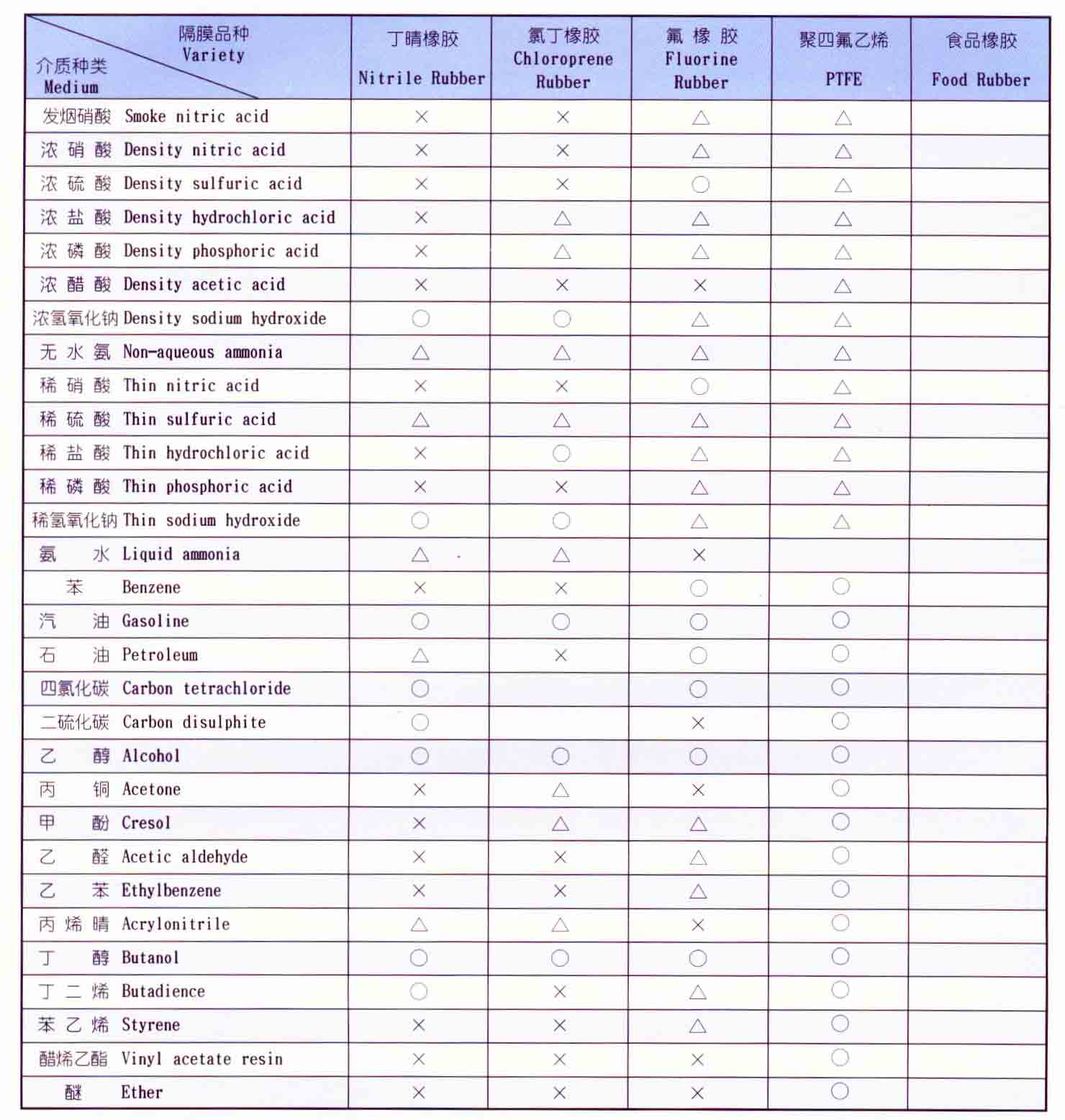 注:○——表示壽命較長;△——表示壽命一般;×——表示不可用。本表僅從耐腐性考慮,因聚四氟乙烯彈性比橡膠差,所以實際使用壽命因壓力,隔膜泵、行程、雜質(zhì)等因素影響而異。