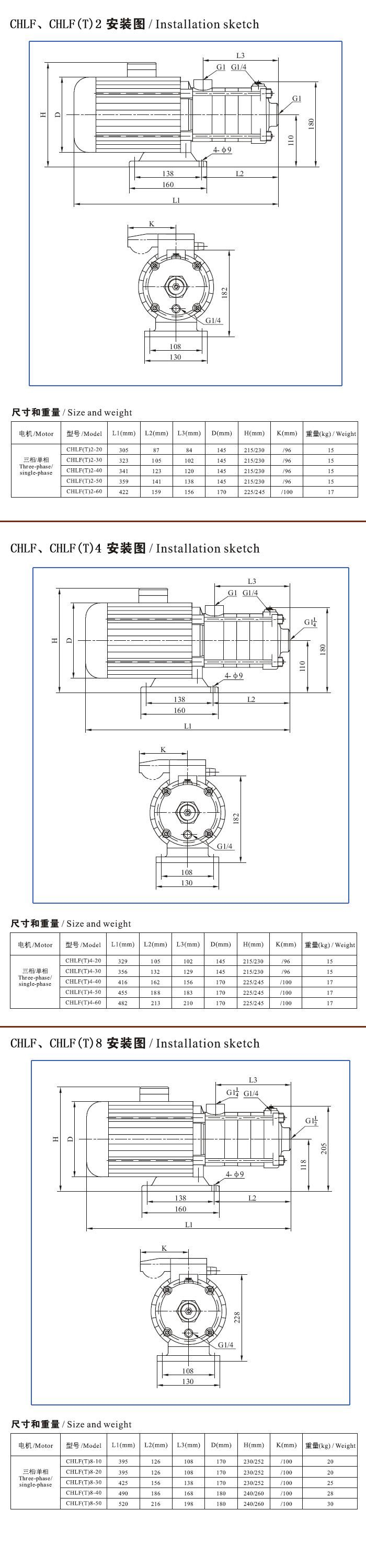 【CHLF型輕型段式不銹鋼多級離心泵】安裝尺寸圖: