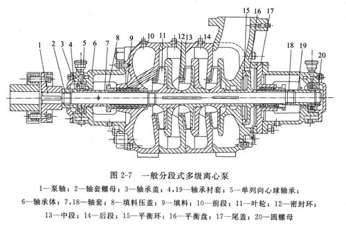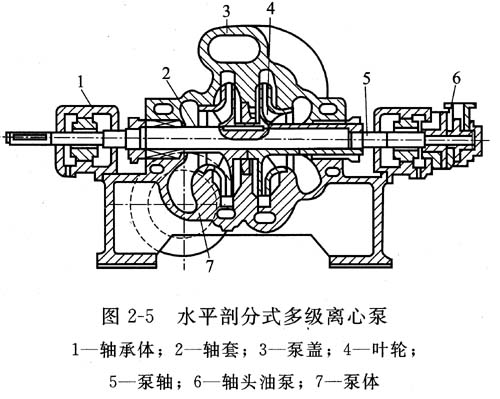 圖2—5所示為水平剖分式多級(jí)離心泵結(jié)構(gòu)。這種泵采用蝸殼形泵體,每個(gè)葉輪的外圍都有相應(yīng)的蝸殼,相當(dāng)于將幾個(gè)單級(jí)蝸殼泵裝在同一根軸上串聯(lián)工作,所以又叫蝸殼式多級(jí)泵。由于泵體是水平剖分式,吸人口和排出臥都直接鑄在泵體上,檢修時(shí)很方便,只需