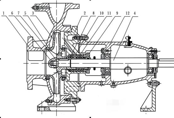 1 泵體 2 泵蓋 3 葉輪 4 軸 5 密封環(huán) 6 葉輪螺母 7 止動(dòng)墊圈 8 軸套 9 填料壓蓋 10 填料環(huán) 11 填料 12 懸架軸承部件