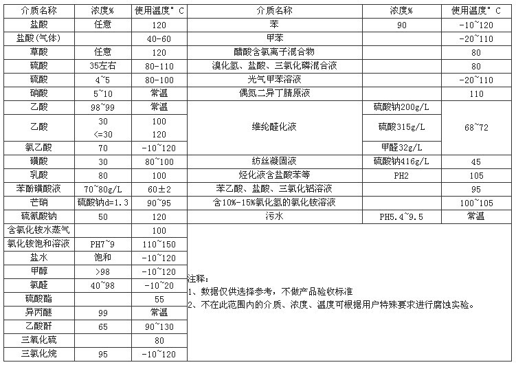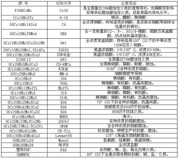 在抗腐蝕材料中,氟塑料具有無可比擬的優(yōu)異性能,除了熔融堿金屬、元素氟及芳香烴類和濃硝酸在170℃以上有腐蝕現(xiàn)象外,在其余各種濃度的鹽酸、硫酸、硝酸、王水、有機(jī)酸、強(qiáng)氧化劑、濃、稀酸交替,酸、堿交替和各種有機(jī)溶劑中均呈 惰 性反應(yīng)。將其內(nèi)襯于泵、閥內(nèi)壁,既克服了氟塑料材料強(qiáng)度低的缺點(diǎn),又解決了泵、閥主體材料抗腐蝕性能差、成本高的不足。另外,氟塑料除了具有優(yōu)異的化學(xué)穩(wěn) 定性外,其防污、防粘性好、動靜摩擦系數(shù)值極小且相近,減摩潤滑性能良好,將其做為閥門啟、閉件的密封副,可降低密封面間磨擦力,減小閥門操作扭矩,提高 產(chǎn)品使用壽命,其使用范圍還可擴(kuò)展到食品、醫(yī)藥工業(yè)。其內(nèi)襯材料除PTFE(F4)、FEP(F46)、PVDF(F2)外,又?jǐn)U展到聚烯烴類的PE、PP及PVC范圍,以滿足各種不同工況參數(shù)的需要。我公司氟塑料泵產(chǎn)品主要有兩大類型,一類為全氟(氟塑料合金)型耐腐蝕泵,(此類為小型泵);一類為全內(nèi)襯氟塑料(F46)型耐腐蝕泵,(此內(nèi)為大型泵)。