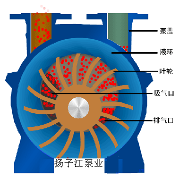 如圖:在泵體中裝有適量的水作為工作液。當葉輪按圖中順時針方向旋轉(zhuǎn)時,水被葉輪拋向四周,由于離心力的作用,水形成了一個決定于泵腔形狀的近似于等厚度的封閉圓環(huán)。水環(huán)的下部分內(nèi)表面恰好與葉輪輪轂相切,水環(huán)的上部內(nèi)表面剛好與葉片頂端接觸(實際上葉片在水環(huán)內(nèi)有一定的插入深度)。此時葉輪輪轂與水環(huán)內(nèi)界面之間形成一個月牙形空間,而這一空間又被葉輪葉片分成和葉片數(shù)目相等的若干個小腔。如果以葉輪的下部0°為起點,那么葉輪在旋轉(zhuǎn)前180°時小腔的容積由小變大,且與端面上的吸氣口相通,此時氣體被吸入,當吸氣終了時小腔則與吸氣口隔絕;當葉輪繼續(xù)旋轉(zhuǎn)時,小腔由大變小,使氣體被壓縮;當小腔與排氣口相通時,氣體便被排出泵外。