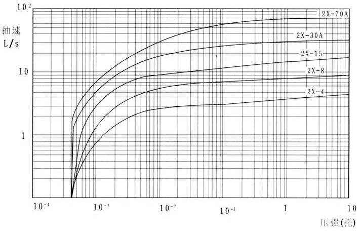 | 2X型旋片式真空泵注意: (1)真空度是指被抽容器內(nèi)剩余氣體壓強,以分壓強為我廠出廠標準,總壓強為輔助標準,熱偶計測的是各種蒸汽和永久氣體的總壓強,而麥氏表只能測出永久氣體占的分壓強,故二表的數(shù)值有一定的差異。 (2)抽氣速率是根據(jù)幾何尺寸算出的在大氣壓強j時,實際抽速與幾何抽速基本相符合,在各種不同的壓強時,抽速有一定下降,抽速與壓力關系見下圖2X旋片式真空泵的性能曲線圖。 (3)溫升是指泵溫穩(wěn)定后,在排氣閥門處的油的溫度與室溫之差。 (4)2X型旋片式真空泵型號表示方法:列2X—4,2代表雙級泵,X代表旋片式真空泵,一橫線后面的數(shù)字4代表每秒鐘的抽速。 五、2X型旋片式真空泵的性能曲線圖: ![]() 六、2X型旋片式真空泵的特點: 2X型旋片式真空泵是用來對抽除密封容器氣體而獲得真空的基本設備也是目前國內(nèi)使用廣泛的真空泵,有水冷和風冷兩種,本泵同國內(nèi)同類產(chǎn)品相比具有真空度高,使用方便,安裝,維護簡單以及以下優(yōu)點: 1.2X型旋片式真空泵設有氣鎮(zhèn)閥,可抽除少量水蒸氣; 圖(1)是2X型旋片式真空泵的工作原理圖,轉子3及7與高真空室外1及低真空室6相切,轉子3及7沿箭頭方向旋轉,帶動轉子槽內(nèi)滑動的轉片旋轉,由于彈簧9及離心力的作用, 轉片外端緊貼高低真空室的內(nèi)表面滑動,把轉子與高低真空室所形成的月洼形空間從進氣嘴2到排氣閥門5和從過氣管4到排氣閥門10之間分隔開來,形成二或三個容積,并且周期性的大小變化,當在圖示旋片式真空泵位置繼續(xù)旋轉時A及C容積逐漸增大,被抽容積氣體沒進氣嘴進入泵內(nèi),同時B及D容積逐漸減少,壓力升高,隨后沖開排氣閥門5及10,將氣體排出真空室外,氣體經(jīng)過油面而排于大氣之中,因為油是淹住排氣門的,故能防止氣體返回真空室。當抽氣壓強較高時,高低真空室的閥門都排氣,相當于單級泵,當真空度較高時,全部氣體進入真空室,再由排氣閥門10排出,此時二級串聯(lián)即進入雙級泵工作。 如被抽除的氣體中含有較高的蒸汽氣體時,在氣體受到壓縮而其蒸汽的分壓強超過此蒸汽在泵內(nèi)溫度下的飽和壓強時,此時蒸氣被壓縮成為液體,旋片式真空泵無法排出,而混在真空油內(nèi),使泵的性能大大降低。如果摻入適量的空氣,使蒸汽在受到壓縮時,其分壓強也低于泵溫的飽和壓強,則蒸汽在變成液體前就能被排出泵外去,故本系列2X-4以上的旋片式真空泵都裝有能放入一定量氣體的摻氣閥11見圖(1)。 |