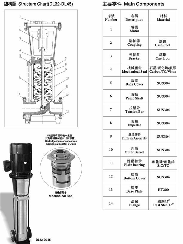 泵殼、葉輪、后蓋、泵軸及導流部件:SUS304或 SUS316L
