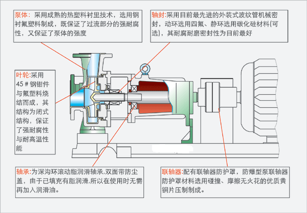 IHF氟塑料離心泵是按國際標(biāo)準(zhǔn)并結(jié)合非金屬泵的工藝設(shè)計(jì)制造。泵體采用金屬外殼內(nèi)襯聚全氟乙丙烯(F46),泵蓋、葉輪和軸套均用金屬嵌件外包氟塑料整體燒結(jié)壓制而成,軸封采用外裝式先進(jìn)的波紋管機(jī)械密封,靜環(huán)選用99.9%氧化鋁陶瓷(或氮化硅),動(dòng)環(huán)采用四氟填充材料,其耐腐耐磨密封性極好。泵的進(jìn)出口均采用鑄鋼體加固,以增強(qiáng)了泵的耐壓性。實(shí)際使用顯示,該泵具有耐腐、耐磨、耐高溫、不老化、機(jī)械強(qiáng)度高、運(yùn)轉(zhuǎn)平穩(wěn)、結(jié)構(gòu)先進(jìn)合理、密封性能嚴(yán)格可靠、拆卸檢修方便、使用壽命長等優(yōu)點(diǎn)。