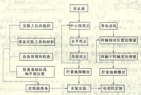 臥式離心泵安裝程序如圖所示。水泵就位前應(yīng)復(fù)查基礎(chǔ)水平和高程。水泵的中心線找正、水平找正,是安裝過程中的關(guān)鍵。