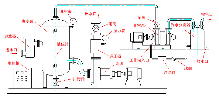 安插在地下的集水管與真空罐入水口相結,當真空泵開啟,真空罐內達到額定的真空度時,集水管內的存水經(jīng)進水過濾器被吸入真空罐內,當達到一定液位時,水泵開啟,罐體的存水經(jīng)調壓器排出,從而實現(xiàn)真空抽水的過程。