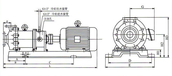 CQB-G型耐高溫磁力驅(qū)動離心泵(簡稱高溫磁力泵)通常由電機,磁力偶合器,水冷卻裝置和耐腐蝕離心泵四大部分組成,其主要特點是利用磁力偶合器傳遞動力。當電動機帶動磁力偶合器的外磁鋼旋轉(zhuǎn)時,磁力線穿過間隙和隔離套,作用于內(nèi)磁鋼上,使泵轉(zhuǎn)子與電動機同步旋轉(zhuǎn),無機械接觸地傳遞扭矩。在泵的動力輸入端,由于液體被封閉在靜止的隔離套內(nèi),沒有動密封因而無泄漏。磁力偶合器的磁性材料采用耐高溫型稀土永磁材料,能承受280度以下的高溫介質(zhì)而保持強大的磁力扭矩。在電機與磁力偶合器之間加裝了水冷卻裝置,防止泵送高溫介質(zhì)之熱量傳導至電機,以保持電機的正常運行,從而達到無泄漏輸送高溫介質(zhì)。